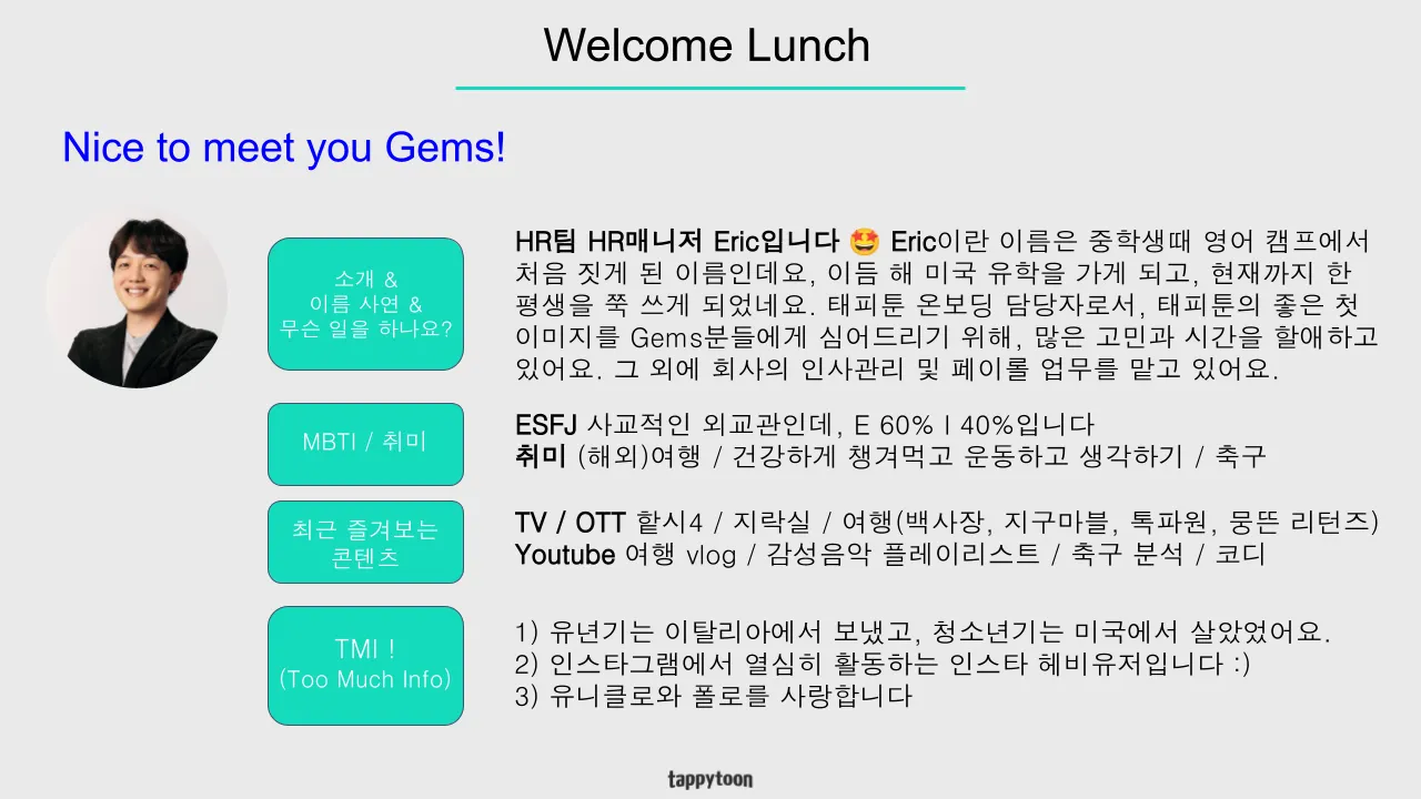 오늘은 조금 특별해진 신규 입사자 웰컴런치에 대해서 소개해 드리려고 합니다. 어느덧 2022년의 절반이 지나가는 시점인데요. 지난 상반기에도 정말 많은 신규 입사자분들이 태피툰에 조인해 주셨습니다. 그동안 아쉽게도 코로나 거리 두기가 강화되면서 한동안 웰컴 런치를 진행하지 못했어요.
