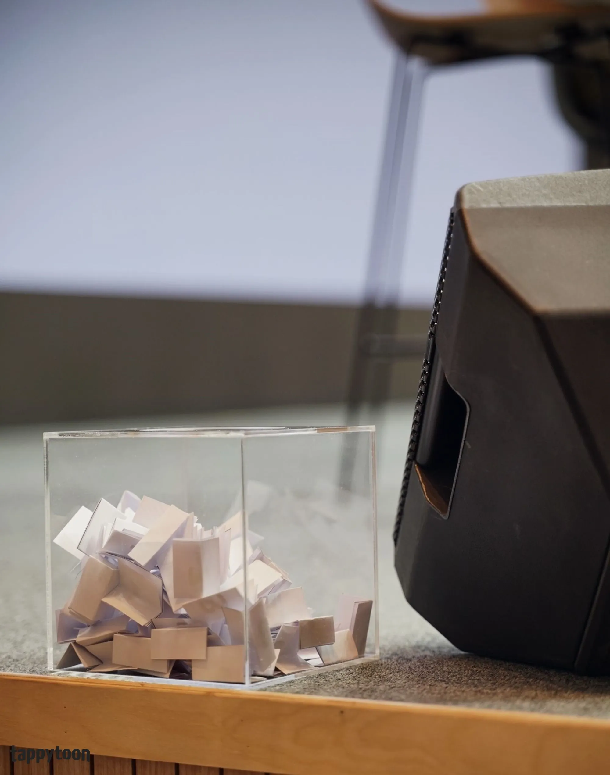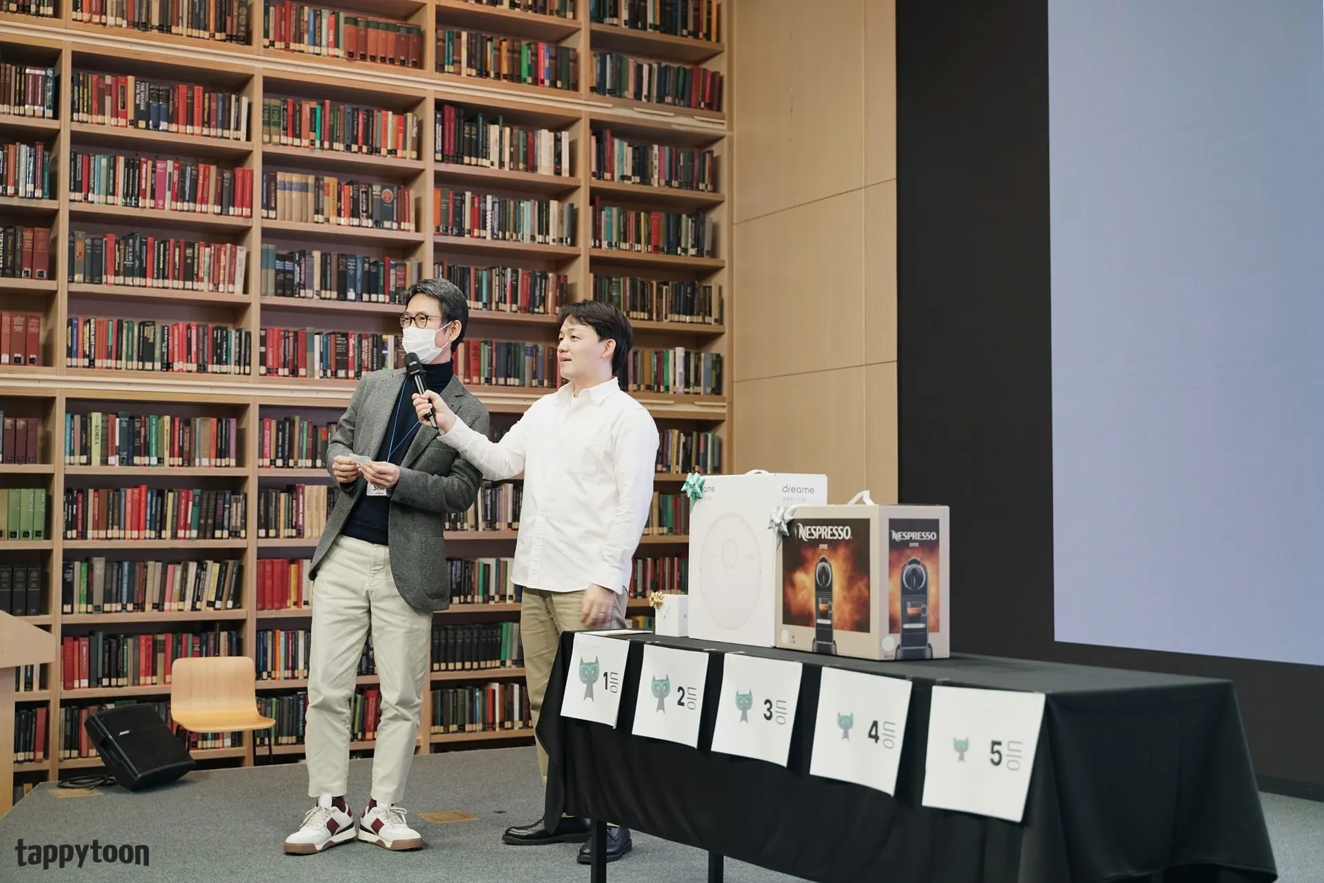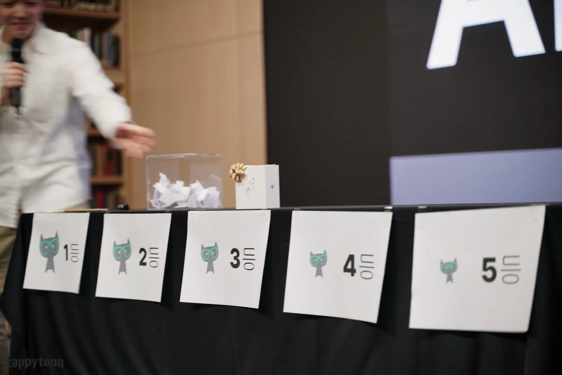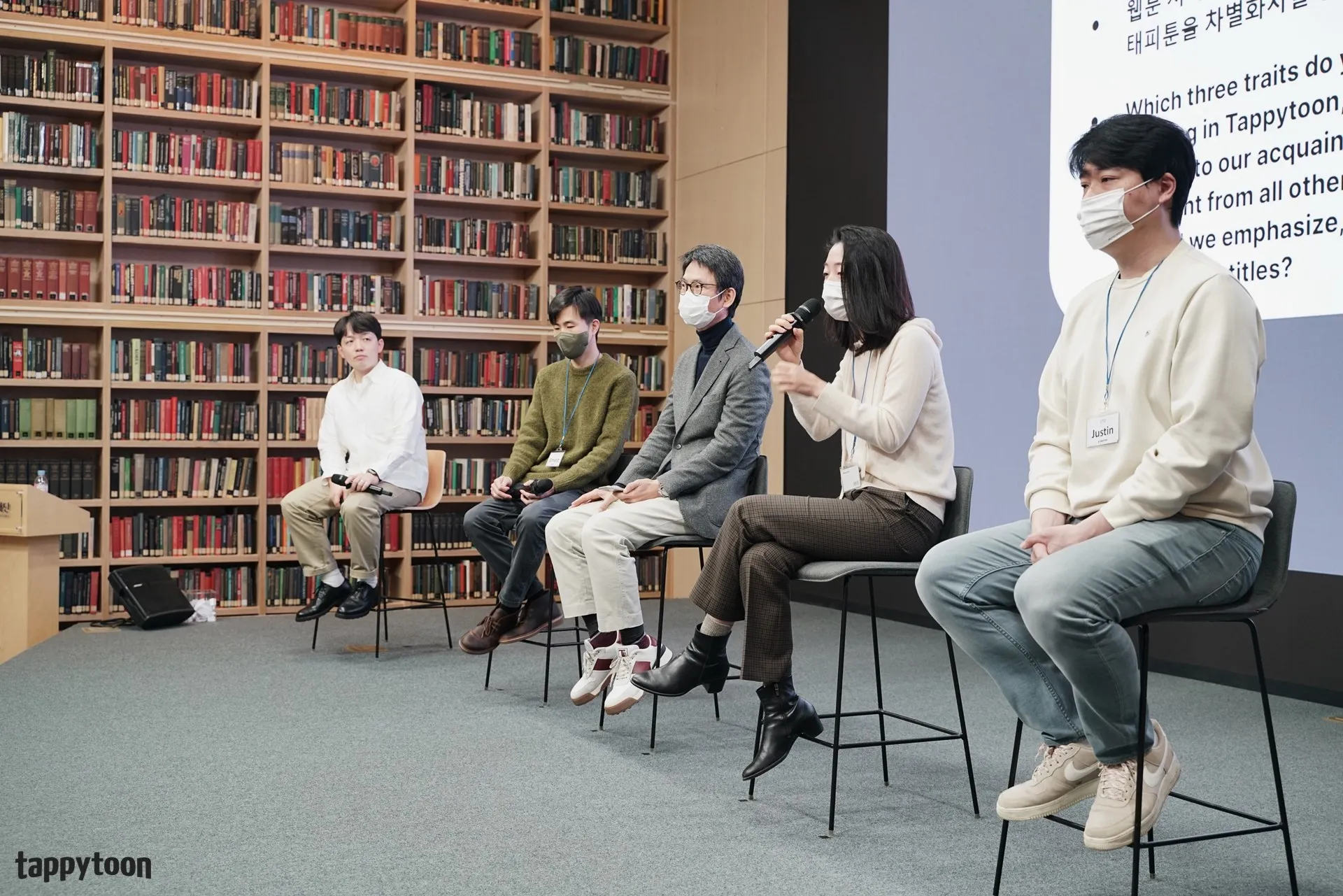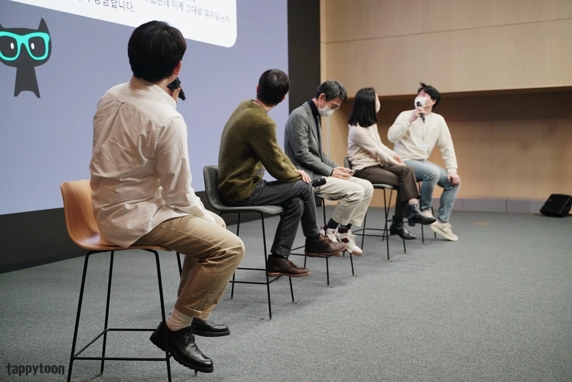 회사와 서비스, 그리고 경영진 네 분에게 평소에 궁금했던 내용들을 사전에 받았는데요, 질문을 카테고리별로 모아서 답변을 듣는 시간을 가졌습니다. 주 카테고리로는 해외 오피스 진출, 조직 문화, 서비스의 방향성, 태피툰의 시장 경쟁력과 차별성, 기술 조직에 관한 질문 그리고 기타 유쾌한(?) 제보들에 대한 해답을 들을 수 있었습니다