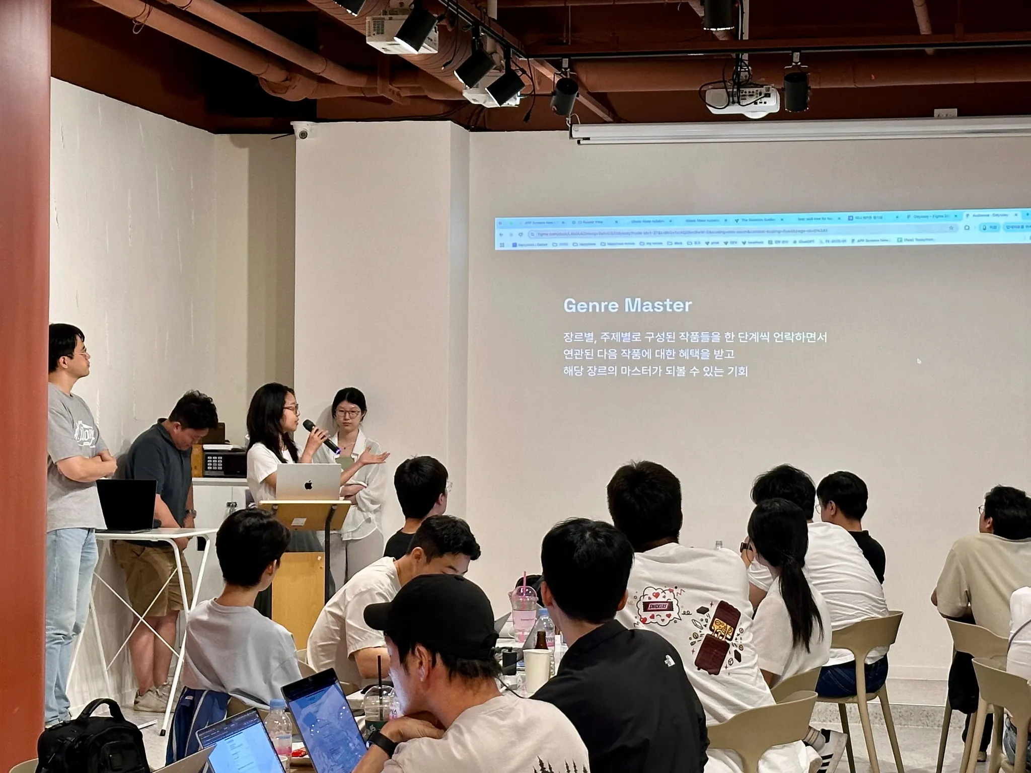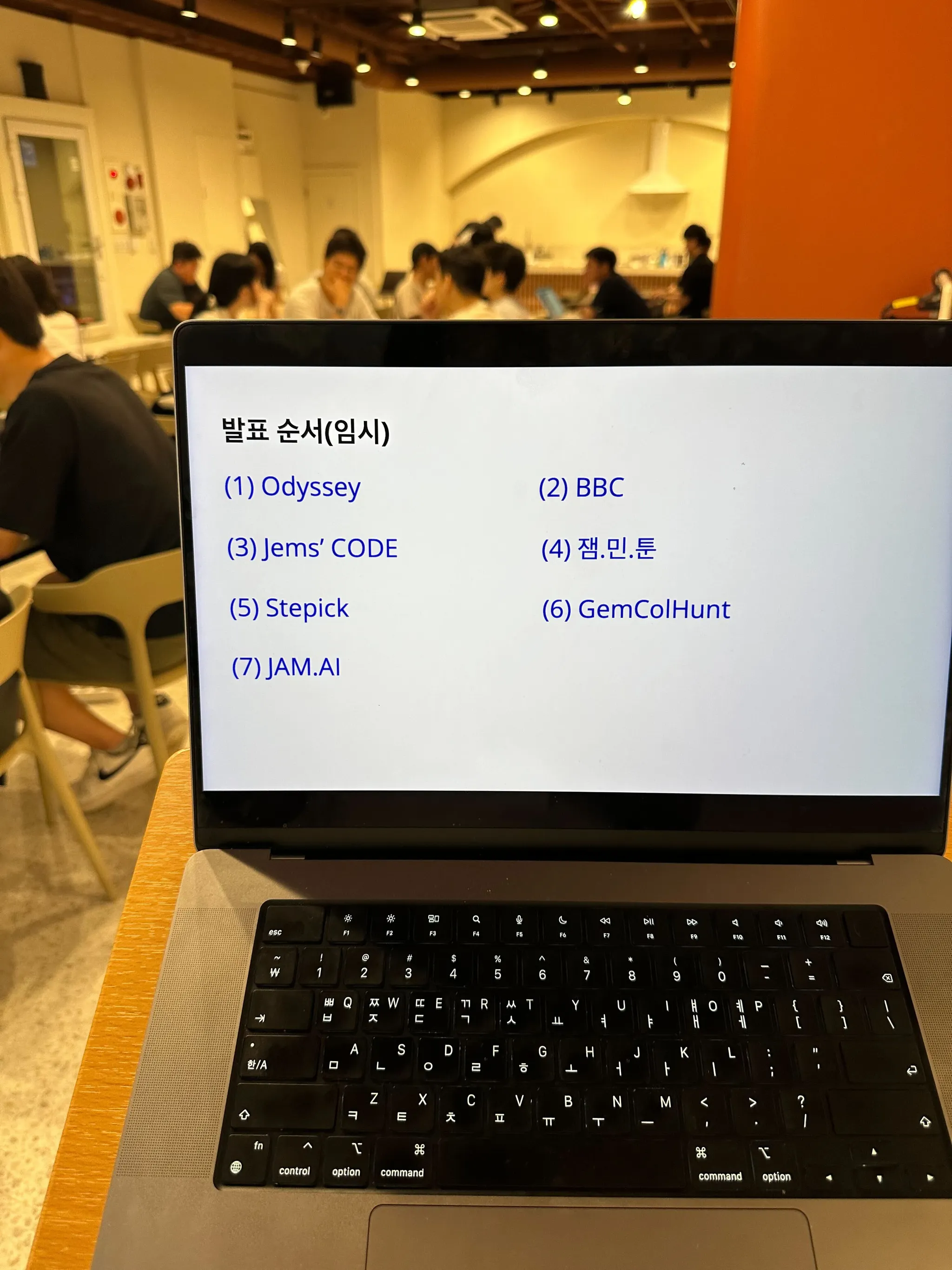 7시간의 치열한 준비를 끝으로 드디어 최종 발표 시간이 찾아왔습니다. 발표 순서는 사다리 타기를 통해 공정하게 정했고, Odyssey - BBC - Jem’s CODE - 잼.민.툰 - Stepick - GemColHunt - JAM.AI 순서로 총 7팀이 결과물을 공유했습니다.