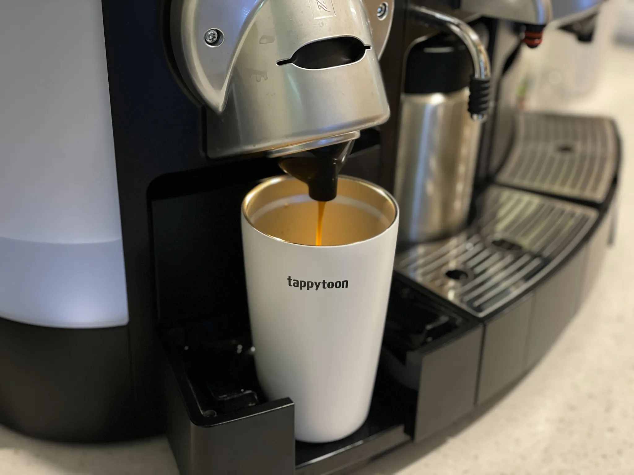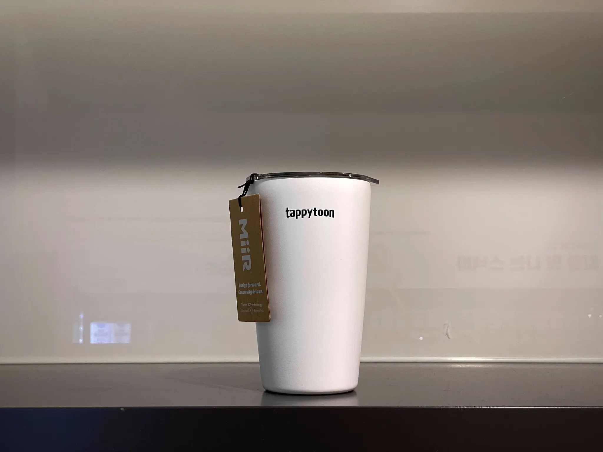 tappytoon로고가 새겨진 흰 텀블러... 예쁩니다. 향긋한 모닝 커피 한잔을 더하여 하루를 기분좋게 시작해 보세요!