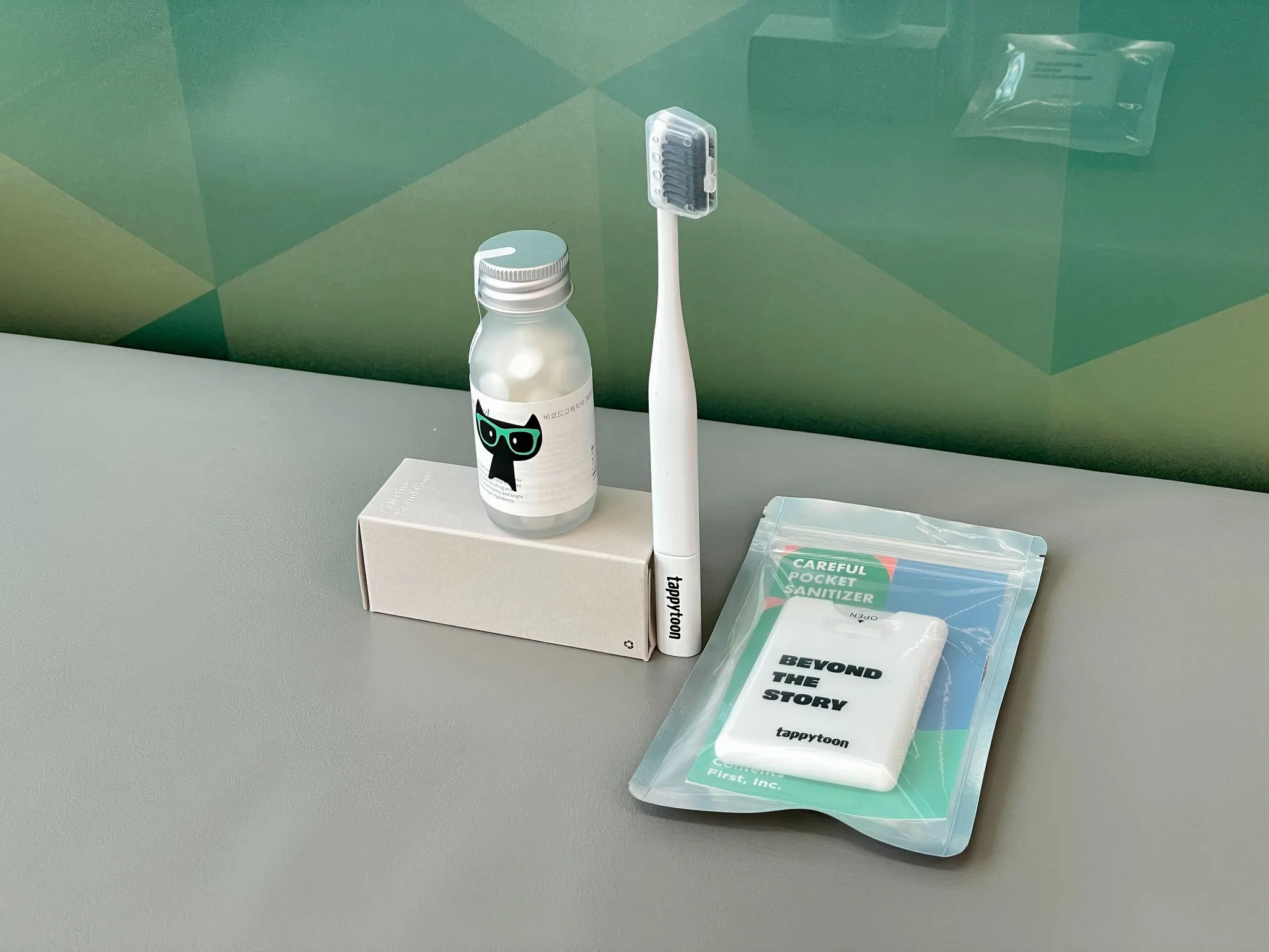 코시국 필수 아이템인 손소독제! ‘칙칙’ 뿌리는 스프레이 타입이라 간편한 사용이 가능해요. 그리고 첫 출근날, 깜빡하고 챙기지 못할 수도 있는 칫솔과 친환경 고체 치약도 함께 들어있어요 (칫솔은 스탠딩이라 잘 세워져요…!)