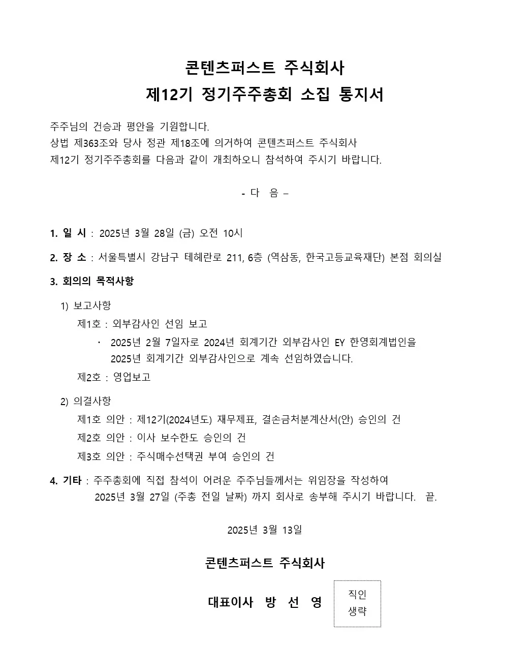 제 12기 정기주주총회 소집공고