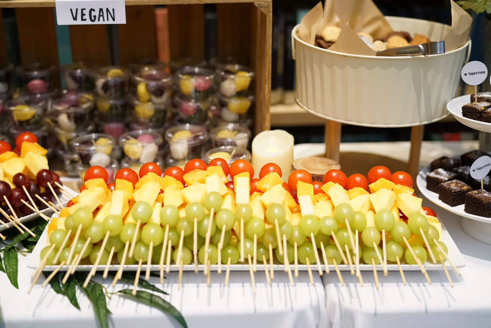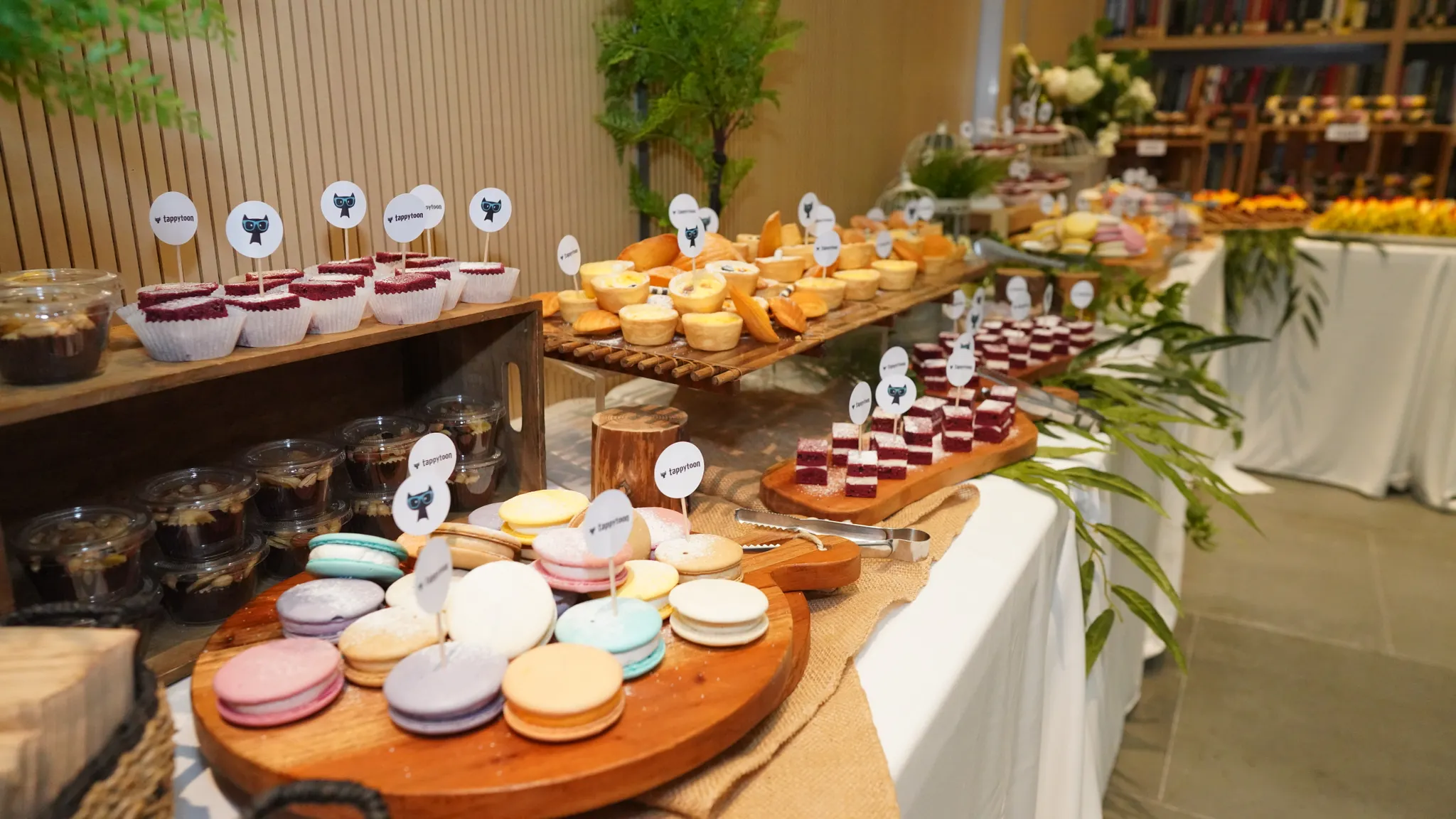 태피툰 마스코트인 Jem의 6가지 각기다른 디자인으로 제작한 케이크팝(먹는 거 맞음. 모형 아님 주의!)와 행사 시간 동안 허기지지 않도록 푸짐하게 준비한 브라우니, 마카롱, 과일꼬치, 꿀떡, 에그타르트, 음료 등을 준비 했어요!