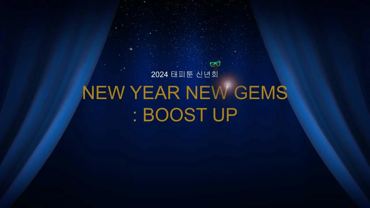 어려운 시기에도 굳건히 각자의 자리를 버텨준 태피툰의 원동력은 바로 Gems 한분한분의 노력과 헌신 덕분이라고 생각합니다. NEW YEAR 에는 모두가 BOOST UP 하는 태피툰이 되기를 소망합니다! HAPPY NEW YEAR TAPPYTOON! 2024년에도 모두 화이팅!