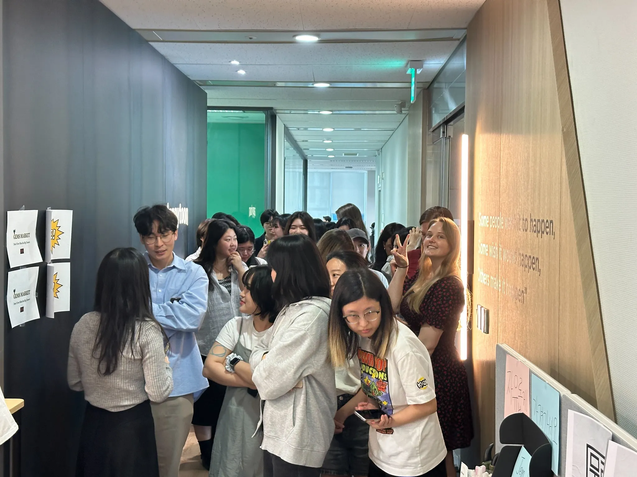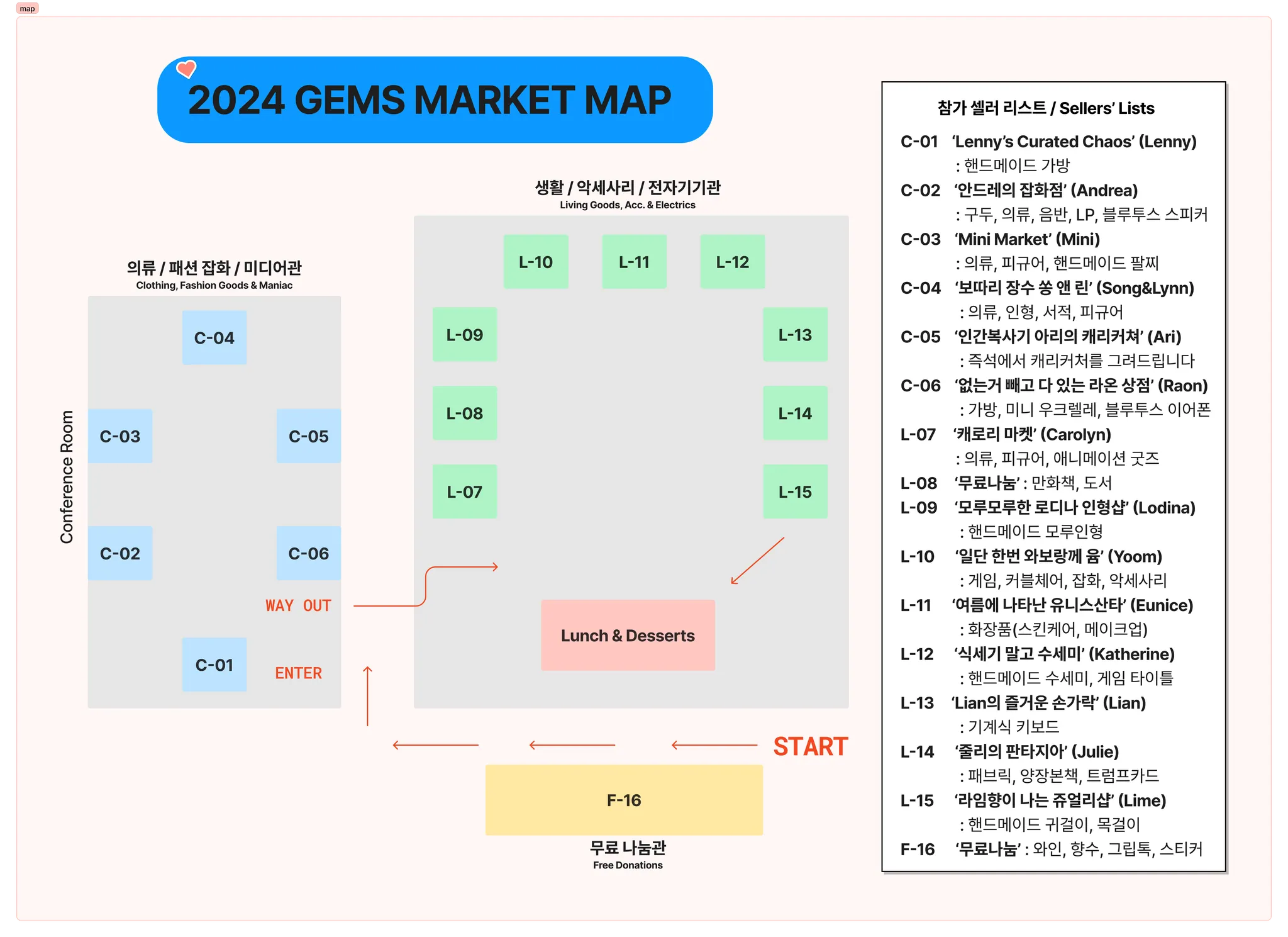 Gems Market Open! Gems Makret에는 총 15개의 부스가 준비 되었어요. 카테고리별로 그리고 판매자의 부스별로 미리 배치도를 공유하며, 함께 기대하는 마음으로 마켓날만을 기다렸죠. 그리고 드디어 마켓 당일! 시작 10분전부터 길게 늘어선 줄을 보니, 갑자기 심장이 쿵쾅쿵쾅 뛰기 시작했어요.