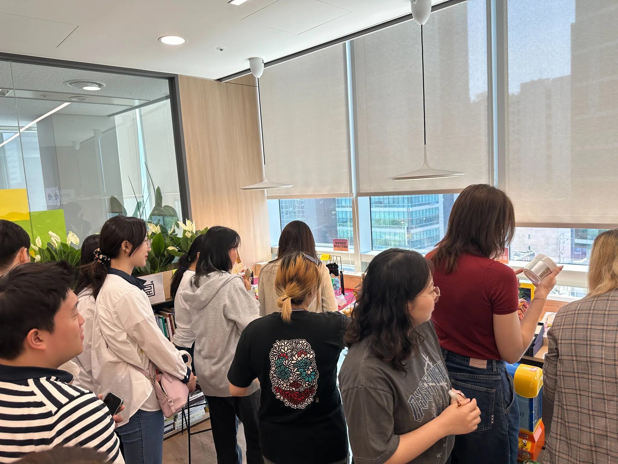 이번 마켓의 취지는 단순히 물건을 사고파는 것에 멈추는 것이 아니라, 그동안 서로 교류하지 못했던 팀 간의 교류할 수 있는 기회의 장과 시간을 마련하는 것이었어요. 구매자는 물건 구매를 위해 자연스럽게 판매자와 대화를 걸며 서로 소통을 이어나갔으며, 심지어 옆자리 판매자끼리도 초면인 분들이 계셔서 서로의 완판을 기원하며 파이팅을 외쳤죠. 태피툰에서 특별 점심과 디저트를 준비하여 구매를 마치신 Gems는 함께 모여 즐거운 시간을 보냈습니다.