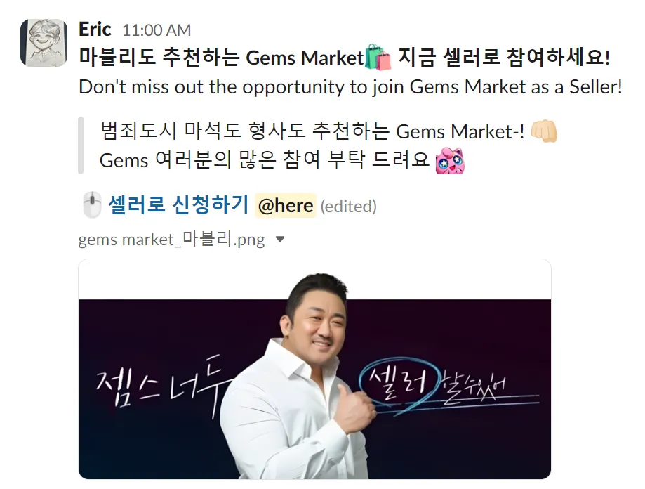 마켓에서는 구매자가 물건을 구매할 수 있는 물건이 필요하죠. 그러려면 태피툰 Gems의 적극적인 참여가 필요했어요. Gems Market을 여는 공지와 함께 Seller 모집도 진행했어요. 우선 Seller는,