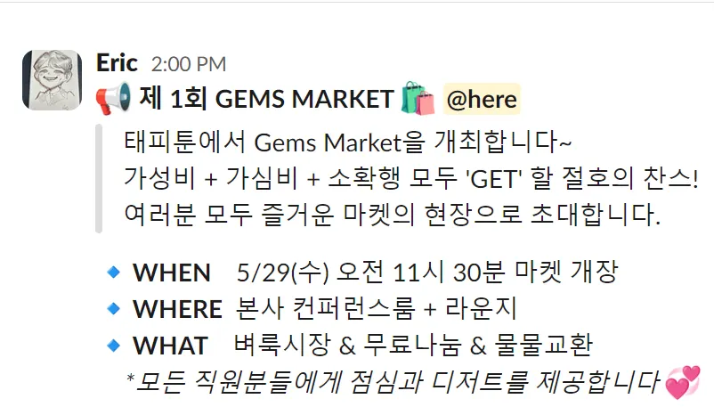 플리마켓은 개인이 가지고 있는 물건을 팔거나, 새로운 물건을 구매할 수 있는 천국과 같은 행사인데요, 아직 뜯지 않았거나, 사용감이 적은 고가의 물건도 저렴하게 구매할 수 있으며, 나에게는 맞지 않은 물건을 필요한 주인이 찾아갈 수 있는 친환경 이벤트죠. 혹시 향수나 옷을 선물받았는데 나와 향이 맞지 않거나 사이즈가 안 맞은 경우가 있지 않으셨나요? 무의식적으로 방치되는 물건들의 잠도 깨우고, 태피툰 멤버들 간에 즐거운 교류도 할 수 있고, 환경도 보호할 수 있는 #알잘딱깔센 이벤트! 2024년 봄을 마무리하는 단계에서, 태피툰에서 처음으로 진행하게 된 플리마켓, 이름하여 ‘Gems Market’ 의 후기를 지금 공유합니다.